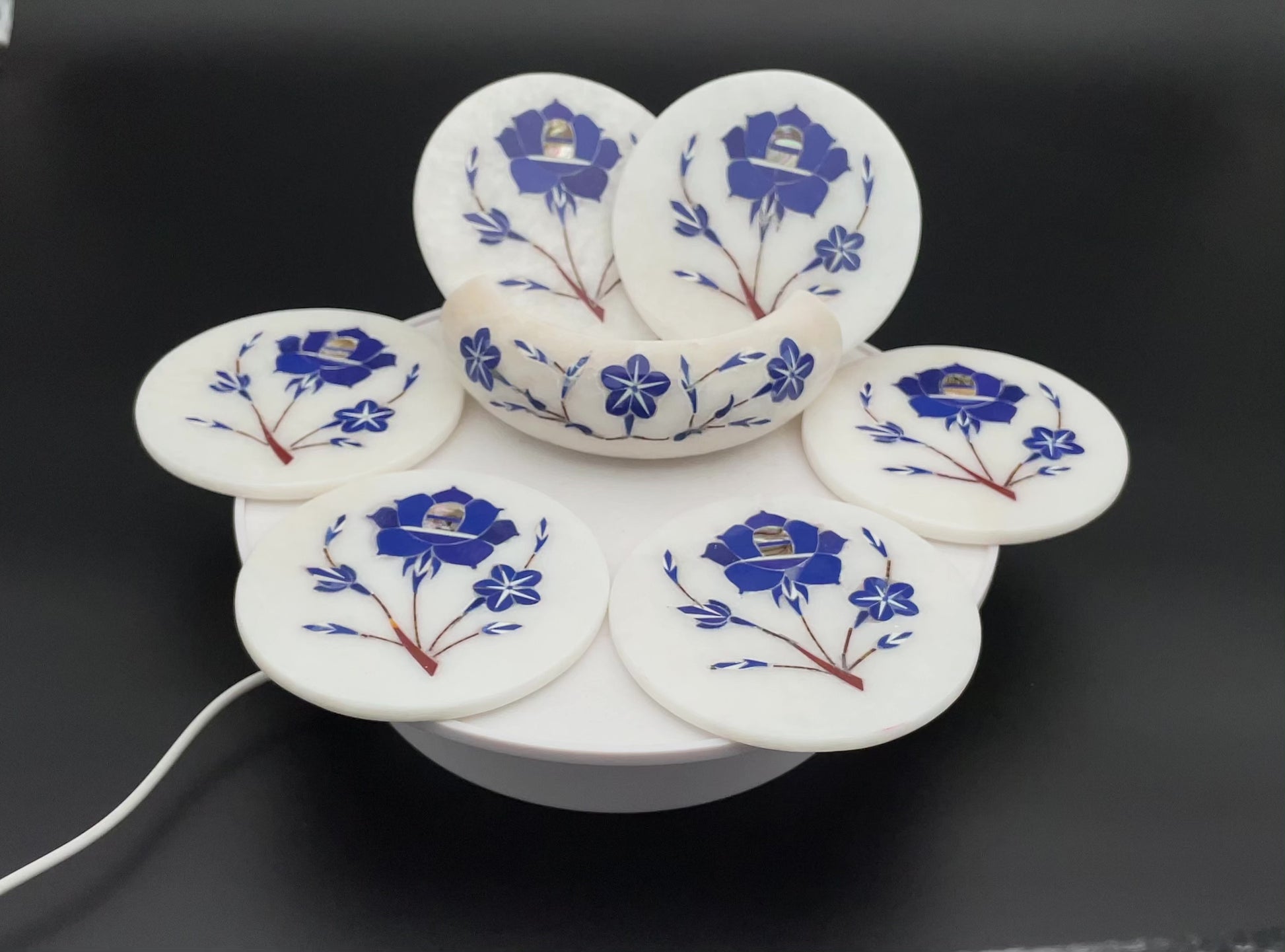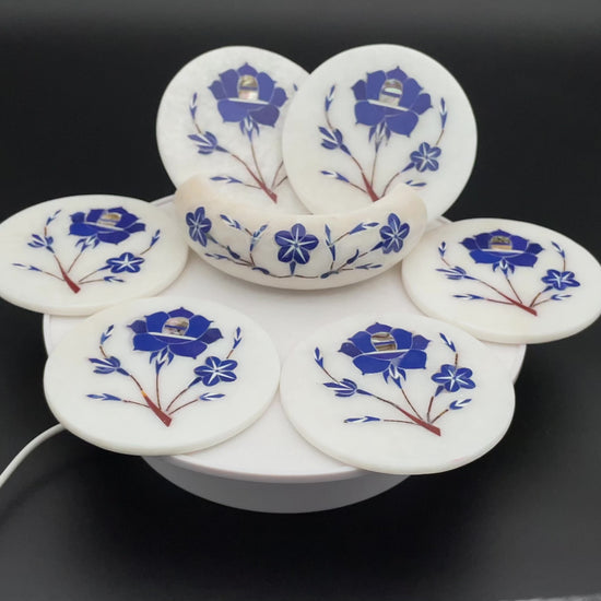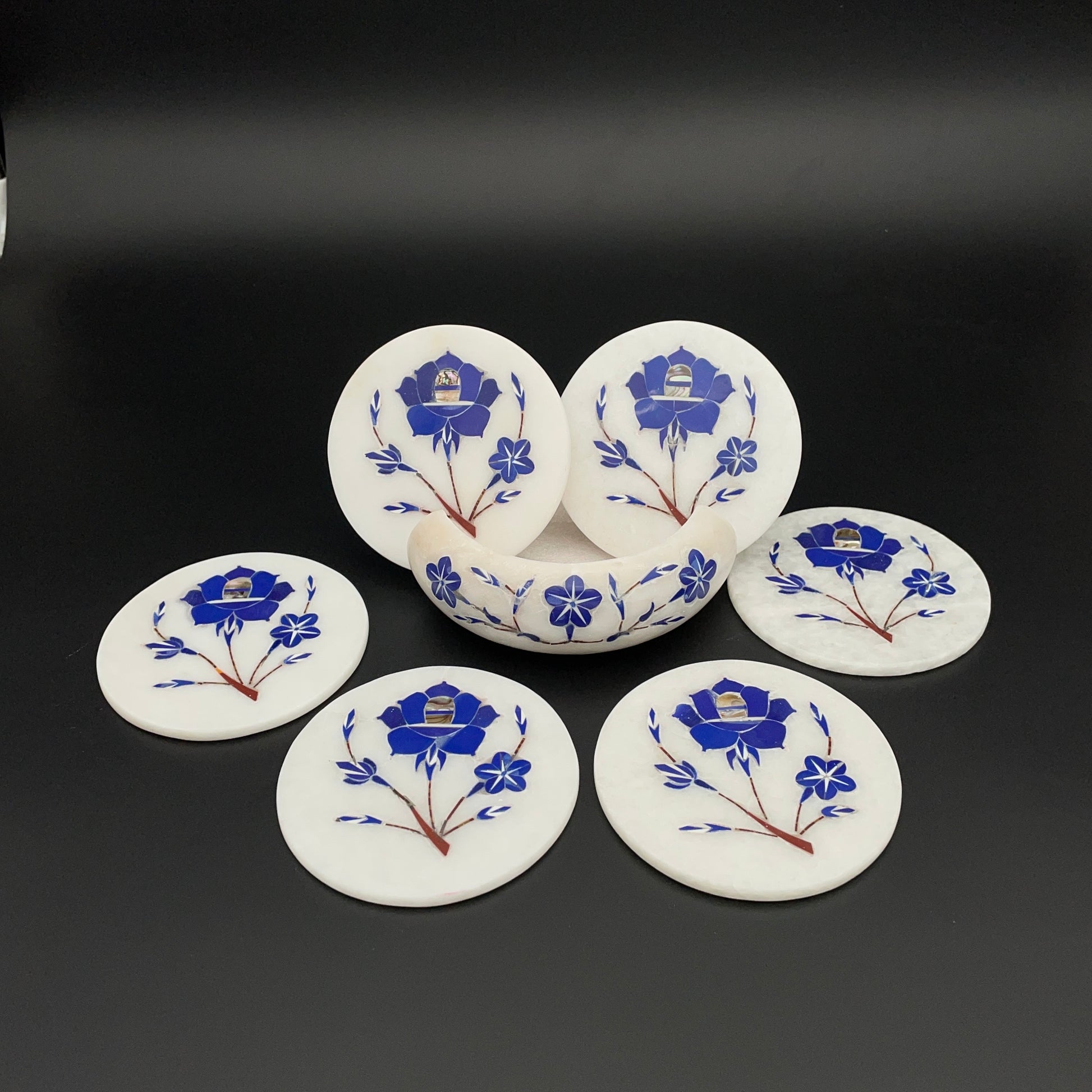 Adorn your furniture and protect them from stains with this handmade white marble inlay coaster set. Crafted from the finest lapis lazuli, jasper, and mother of pearl, the coasters will make a statement in any living space. Enjoy the beauty of natural stones, and keep your surfaces clean. Set of 6.