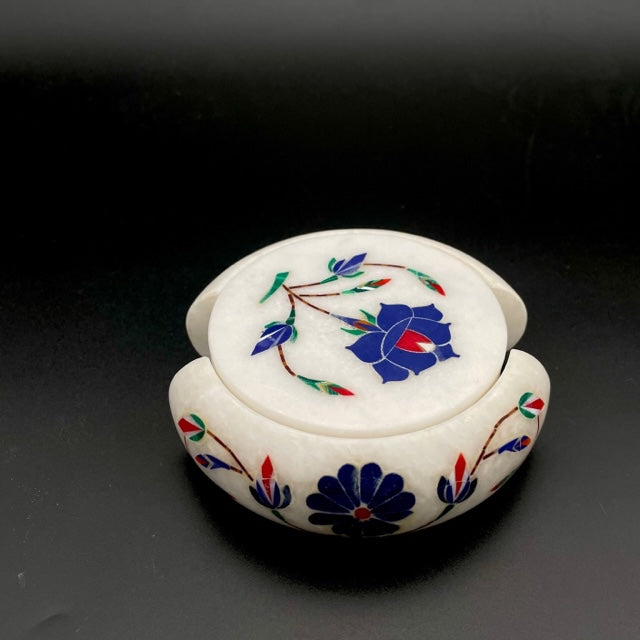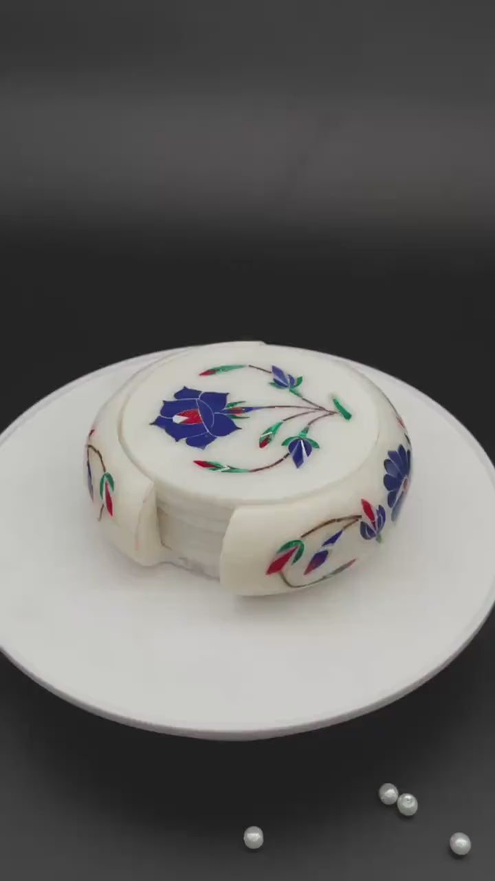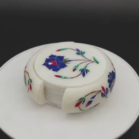 Adorn your furniture and protect them from stains with this handmade white marble inlay coaster set. Crafted from the finest lapis lazuli, jasper, and mother of pearl, the coasters will make a statement in any living space. Enjoy the beauty of natural stones, and keep your surfaces clean. Set of 6.