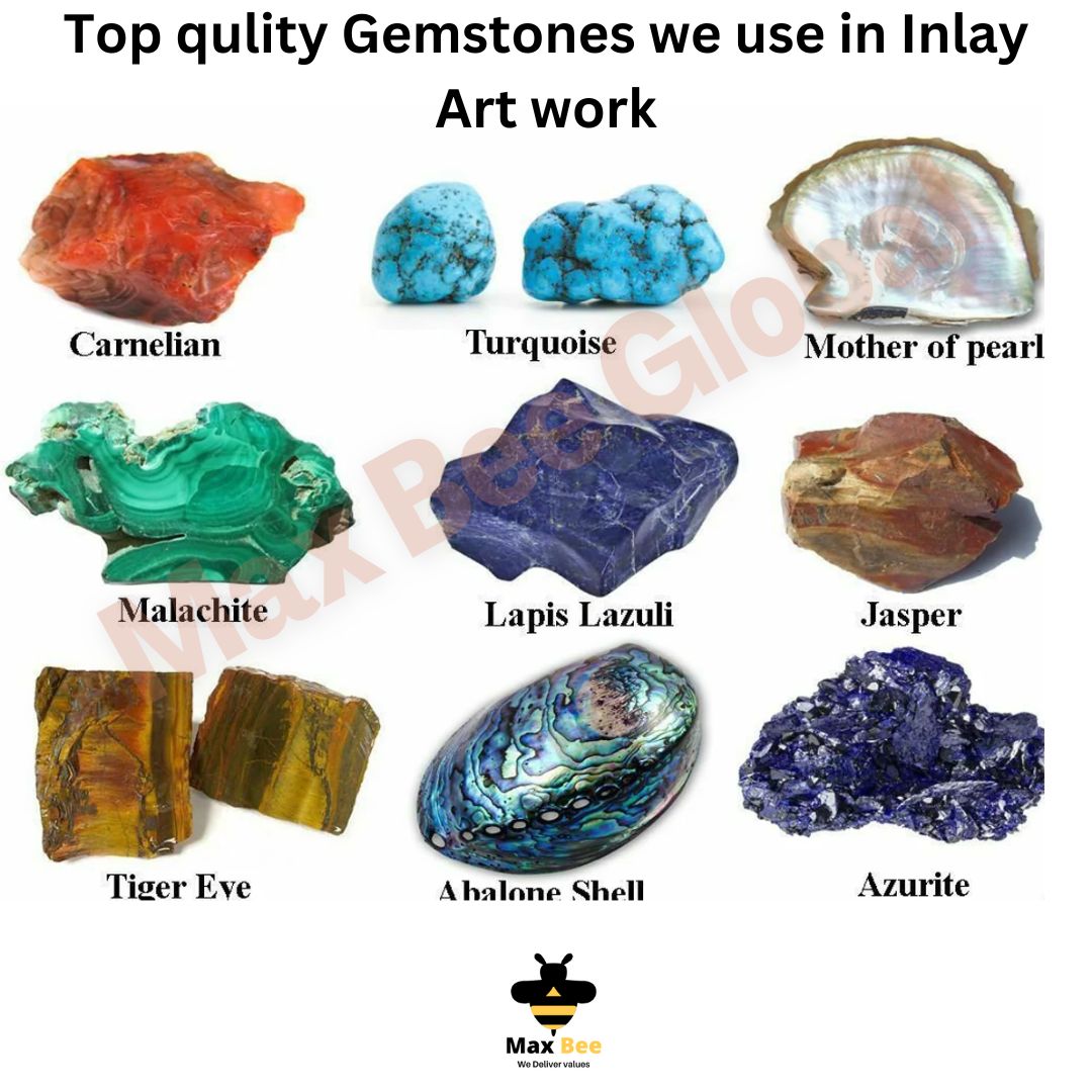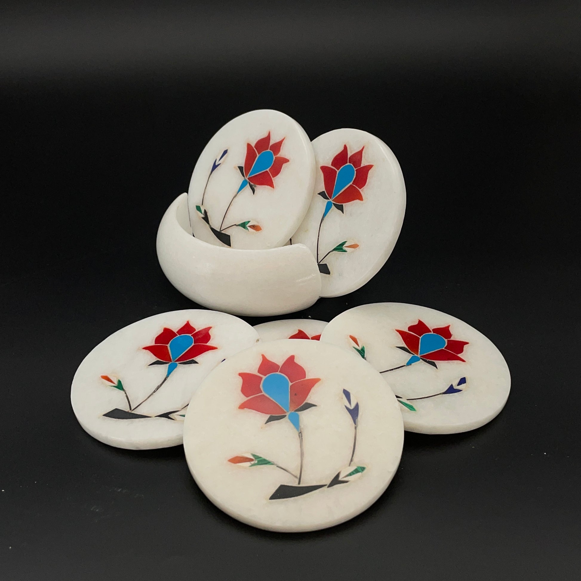 This set of 6 handmade white marble coasters is expertly inlaid with malachite, carnelian, and jasper semi-precious stones. Each coaster is unique in appearance, making this a distinctive decor piece. The natural stones add a touch of timeless elegance to any home.